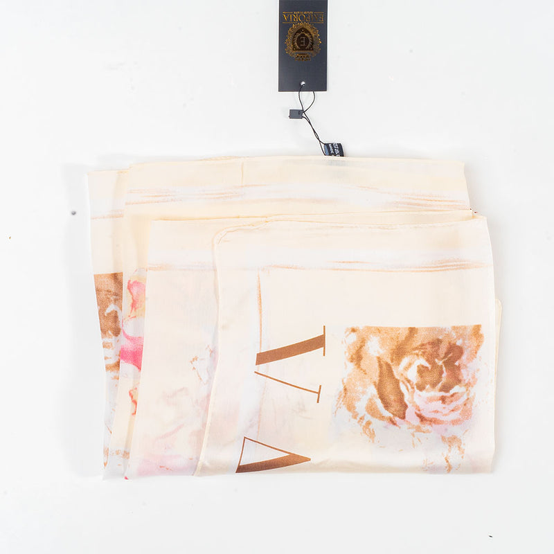 Eșarfă „Flori & Litere”, 85 x 180 cm, albă, 100% mătase vegană