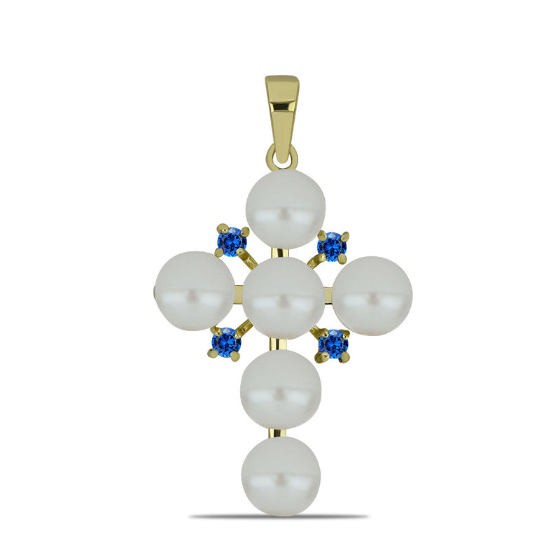 Cruce Pandantiv din Argint 925 Placat cu Aur ( 1.89 grame ) cu Perlă de Apă Dulce Albă și Safir Albastru Australian 7.46 Carate